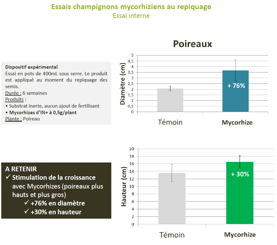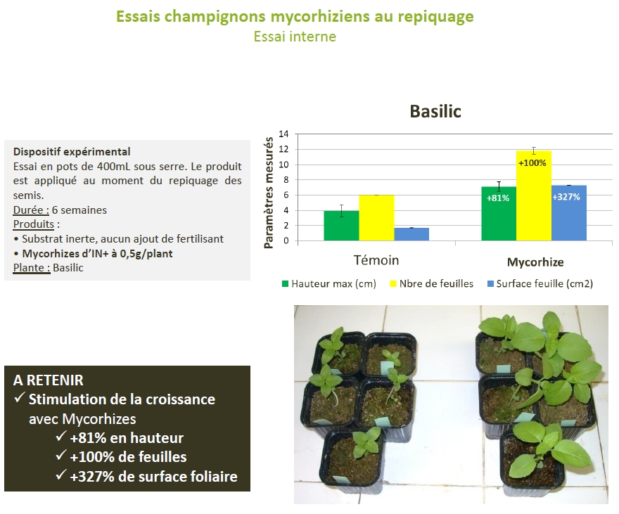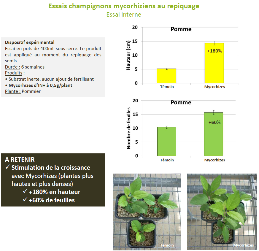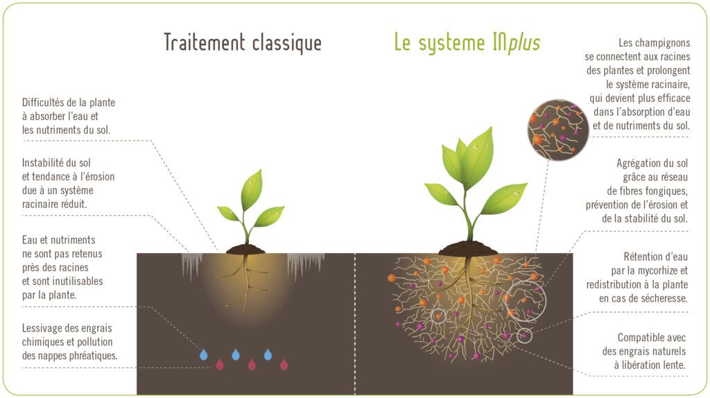 En fournissant à la plante beaucoup plus d’eau et de nutriments, les champignons mycorhizogènes contribuent à la croissance, à la résistance et à la santé des plantes. Tout comme nous, les plantes ont besoin d’un bon approvisionnement en eau et nutriments naturels. En fournissant aux plantes ce dont elles ont besoin, les champignons mycorhizogènes favorisent une croissance optimale et le développement d’une résistance naturelle. La mycorhization constitue pour les plantes une base solide favorisant le dépassement des périodes de stress (sécheresse, salinité excessive, pollution, attaques d’agents pathogènes…).